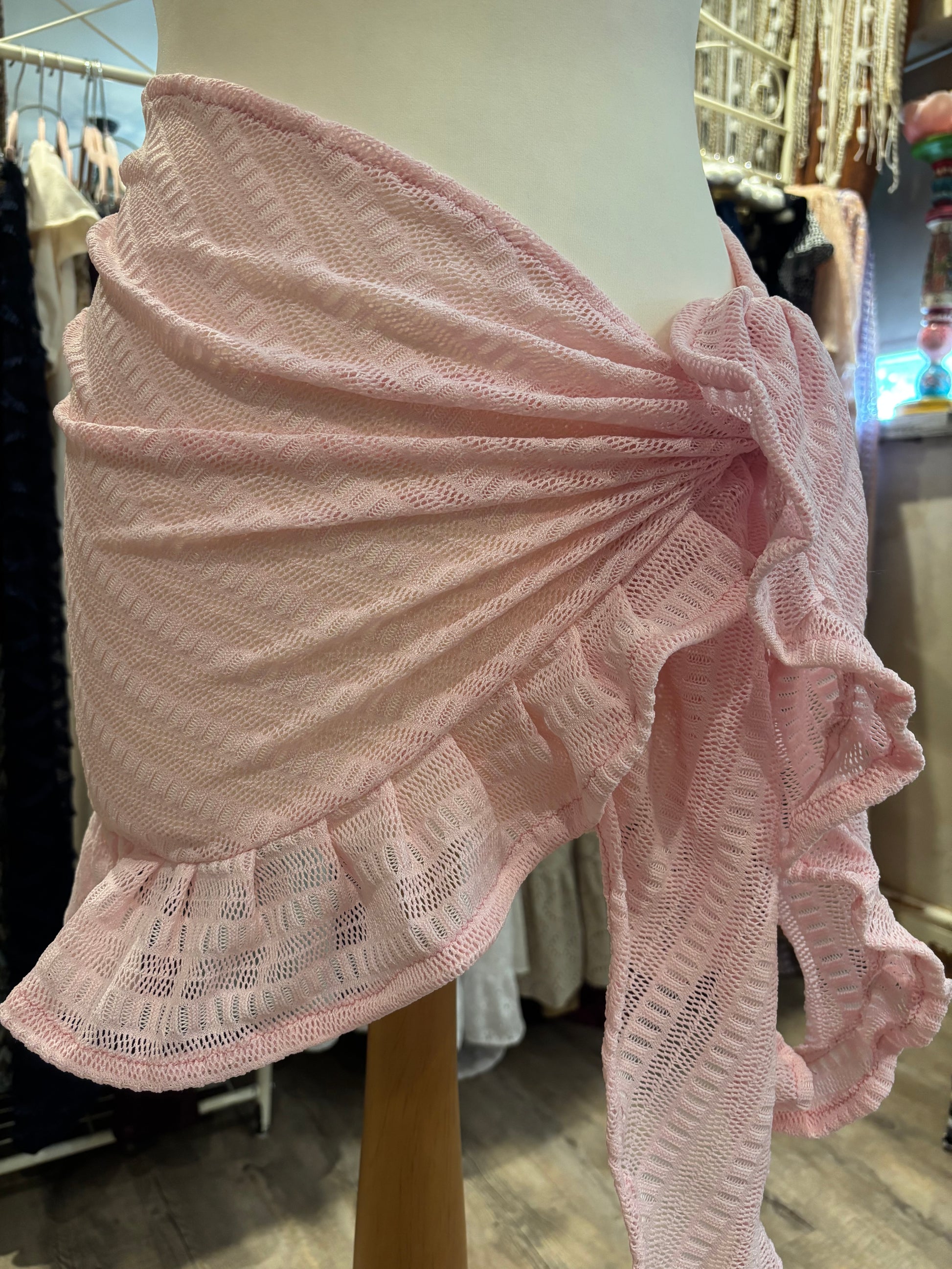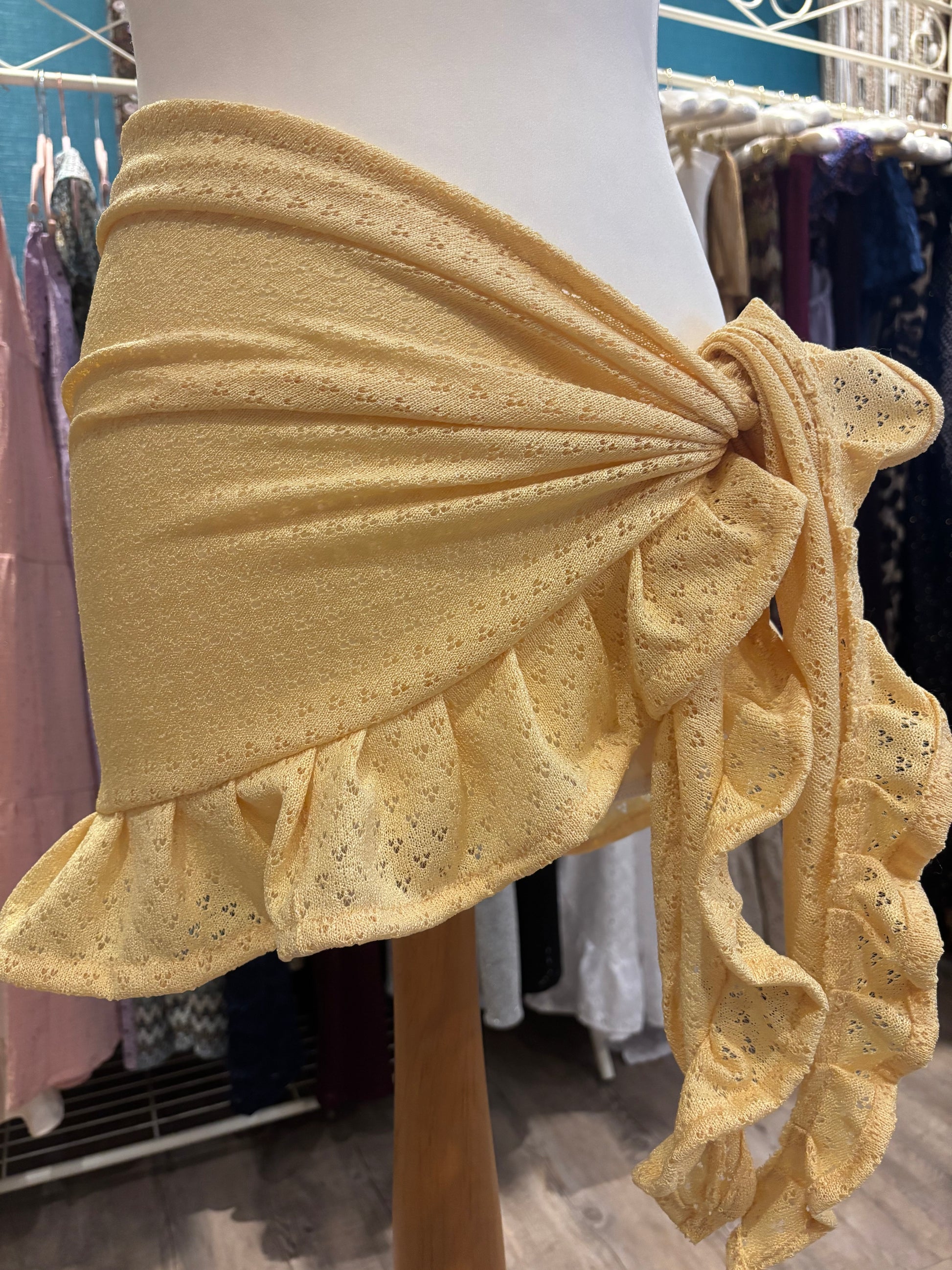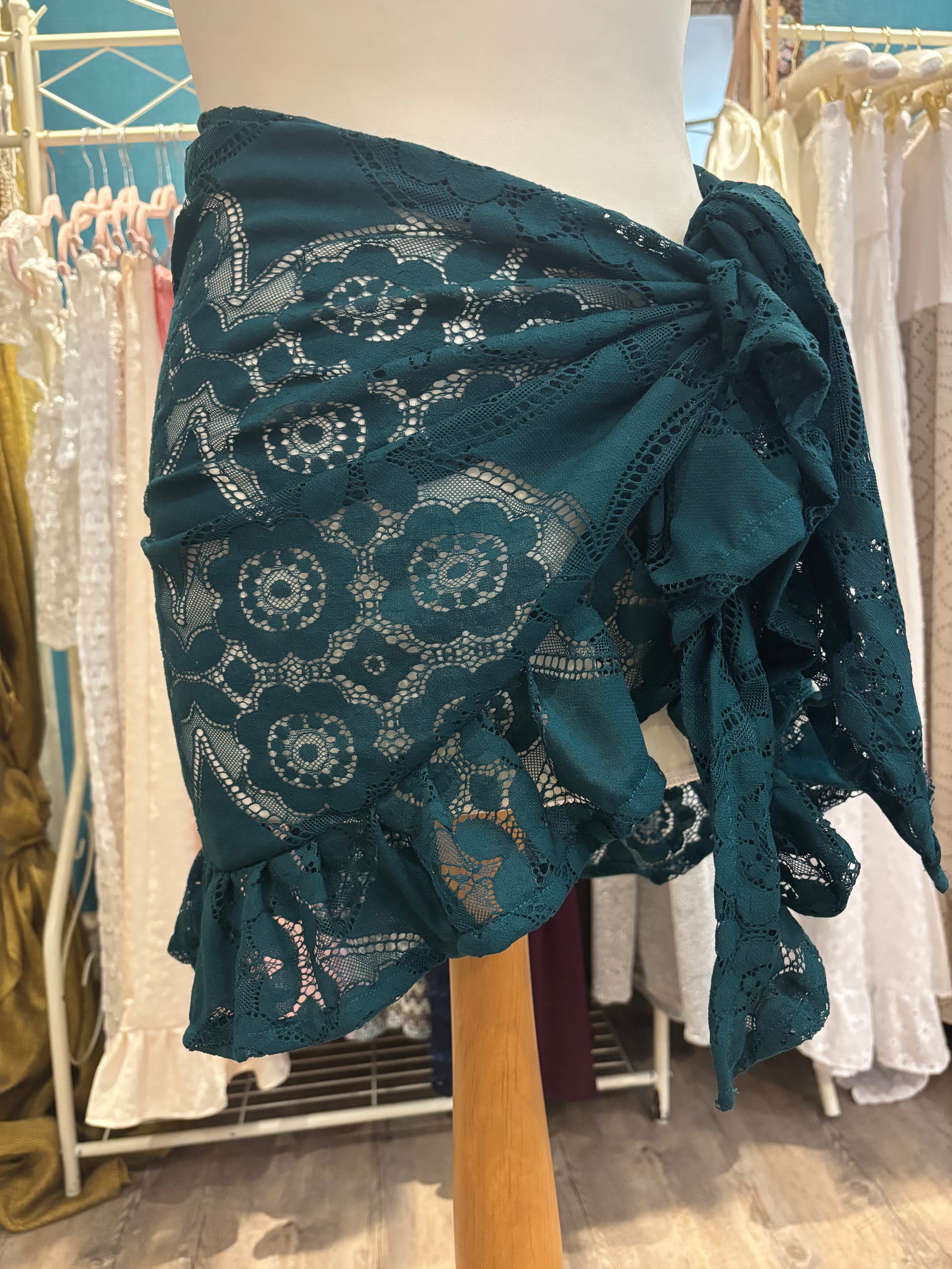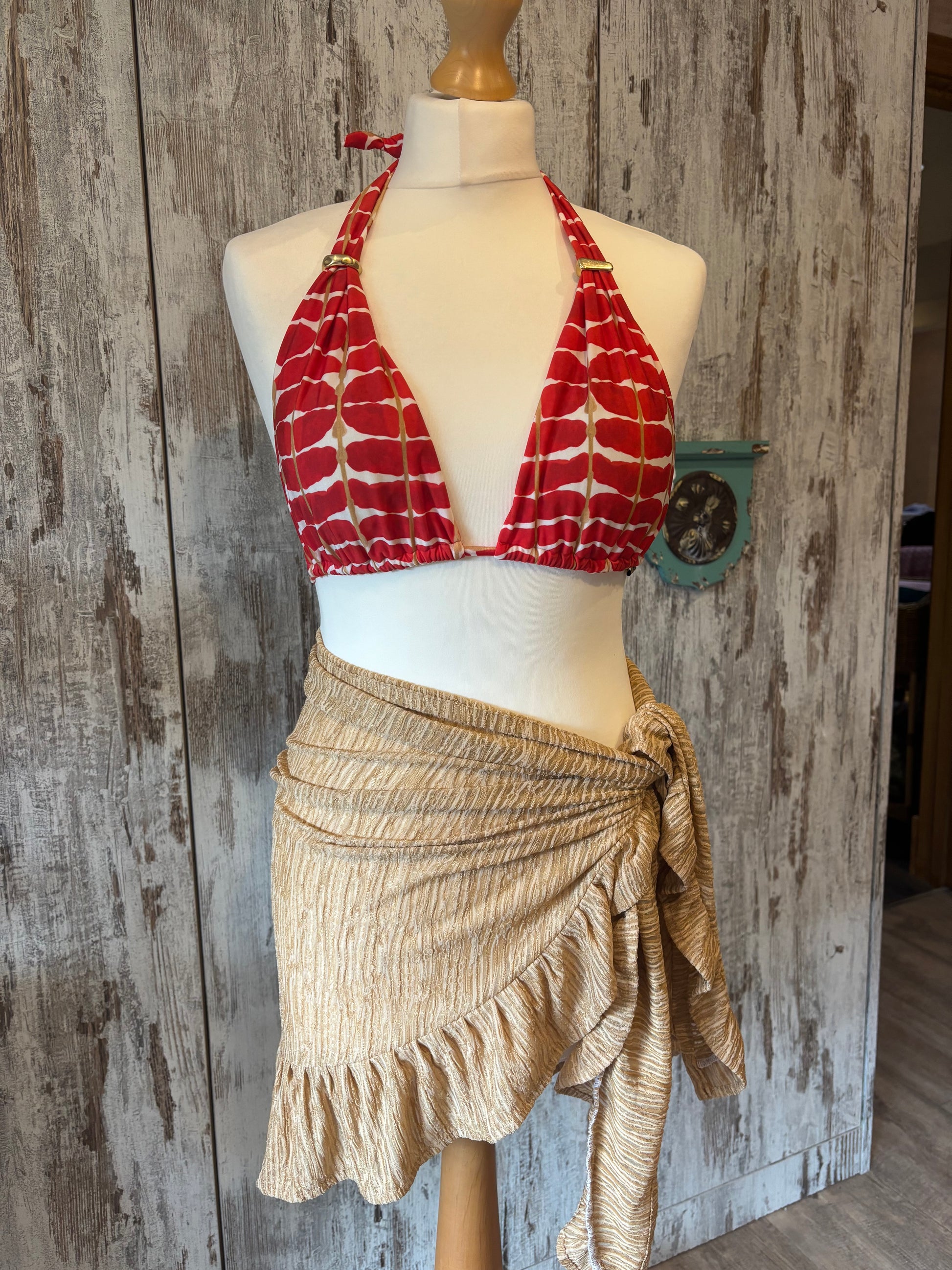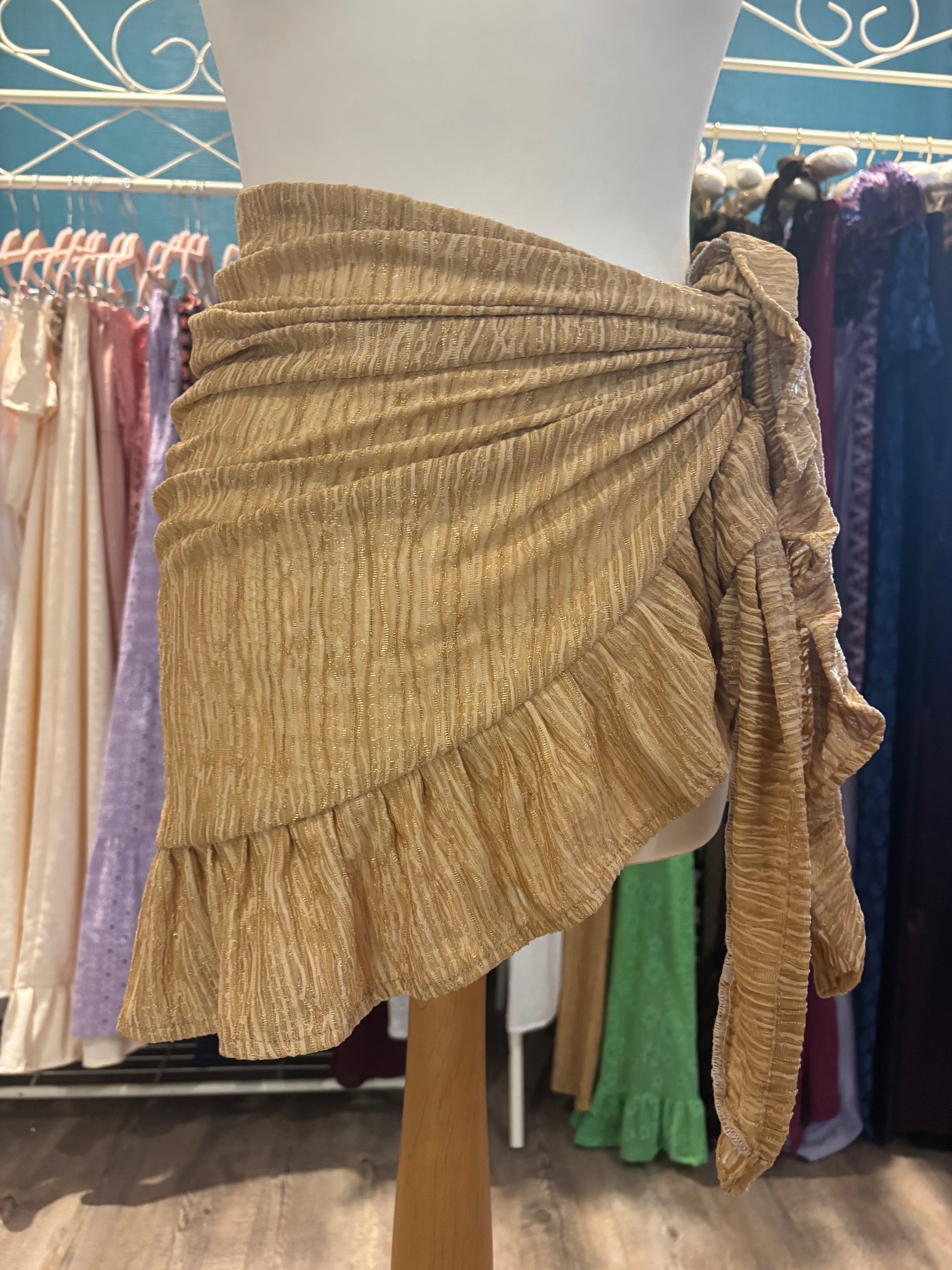 Kate is wearing our short ruffle sarong in a size xs. She is wearing our gold in the first photo & our black patchwork lace in the second photo