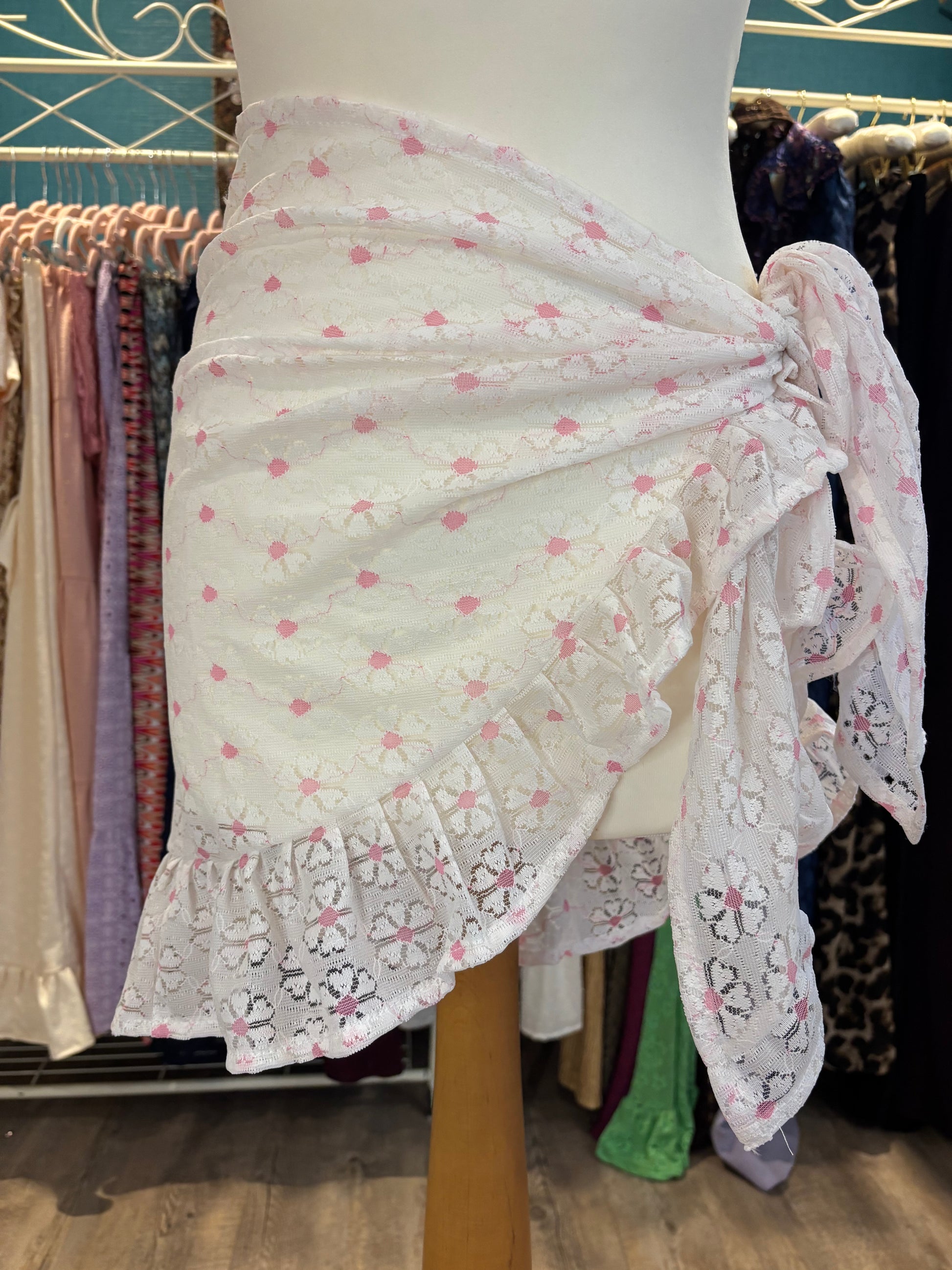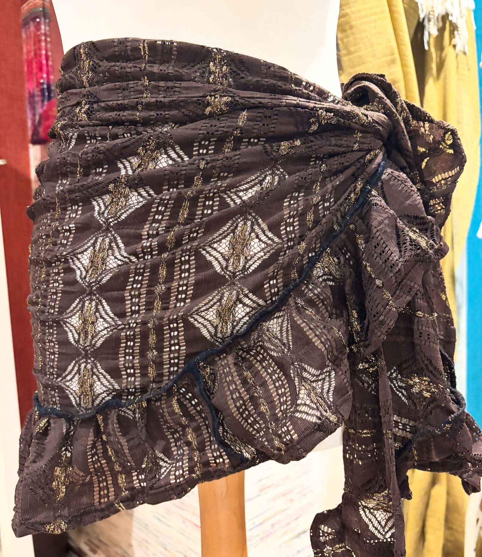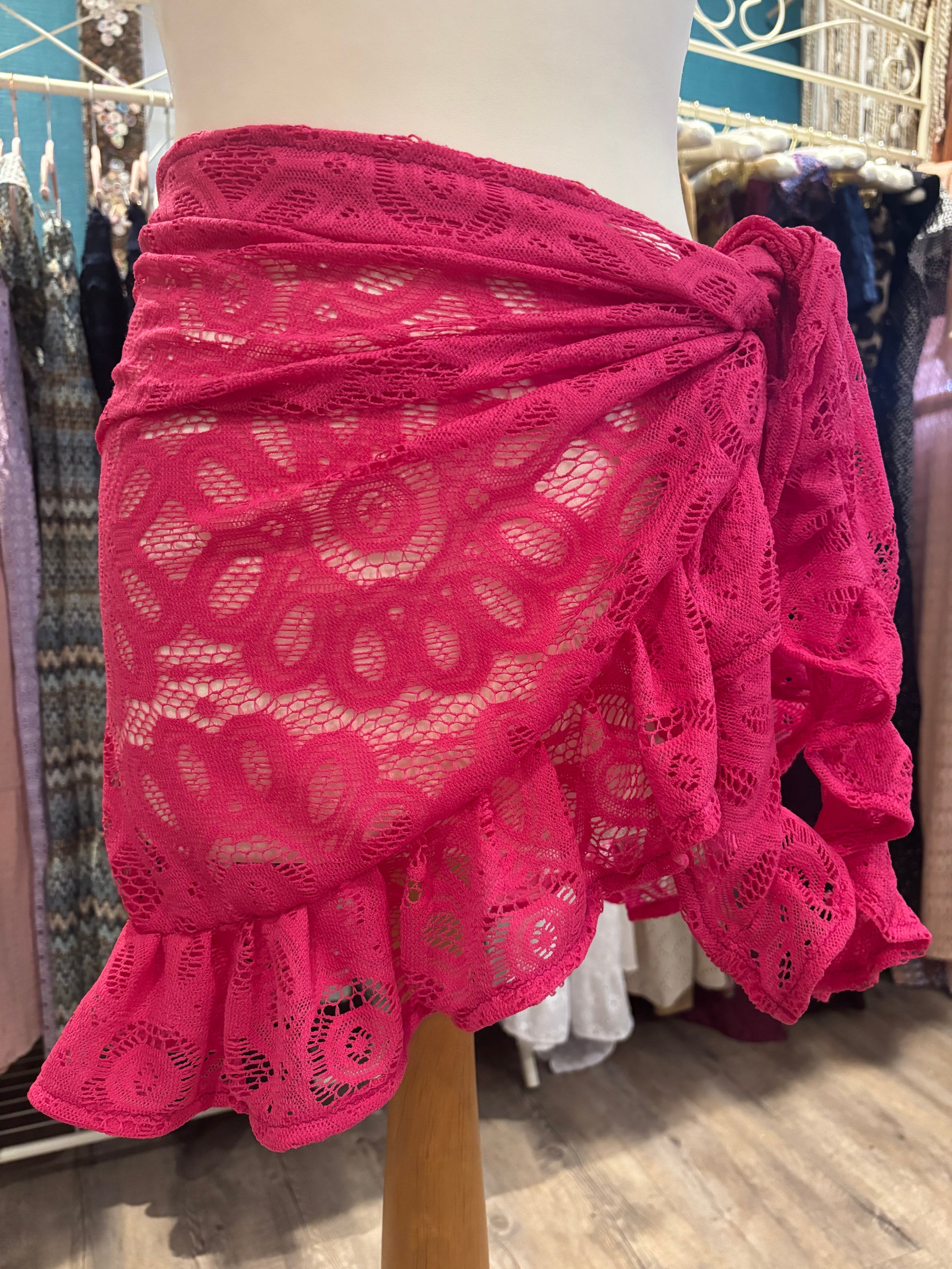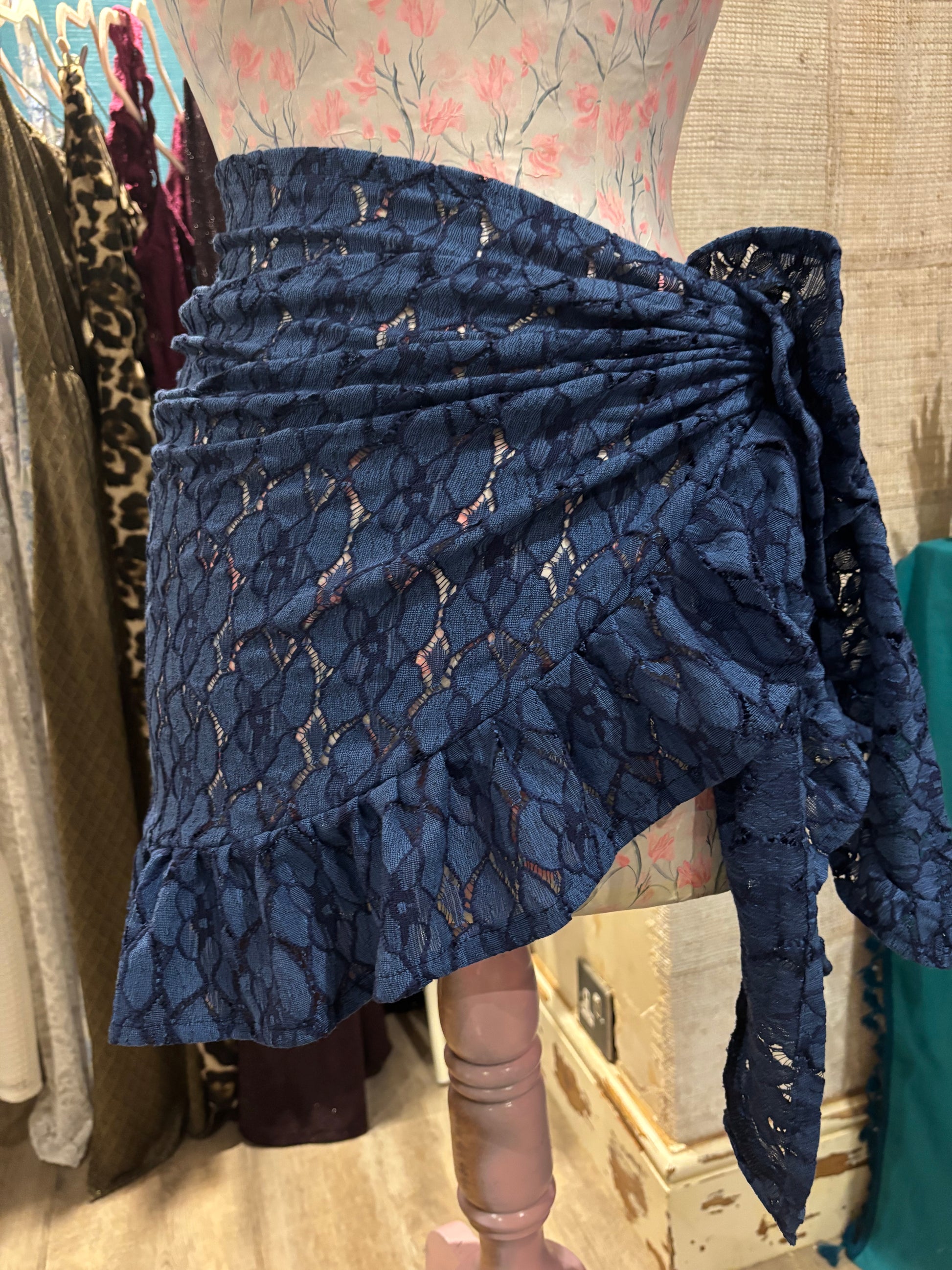 Kate is wearing our short ruffle sarong in a size xs. She is wearing our gold in the first photo & our black patchwork lace in the second photo