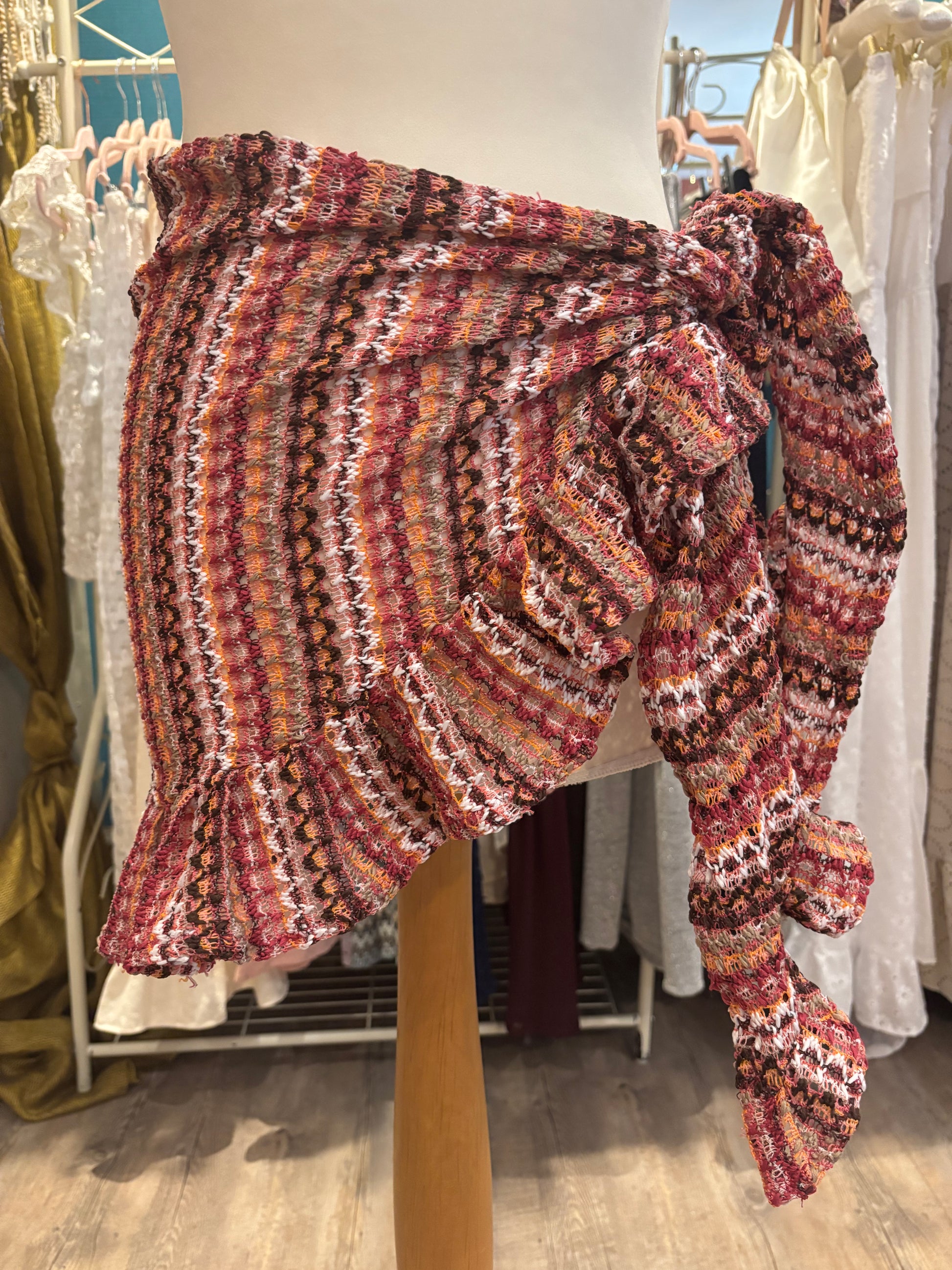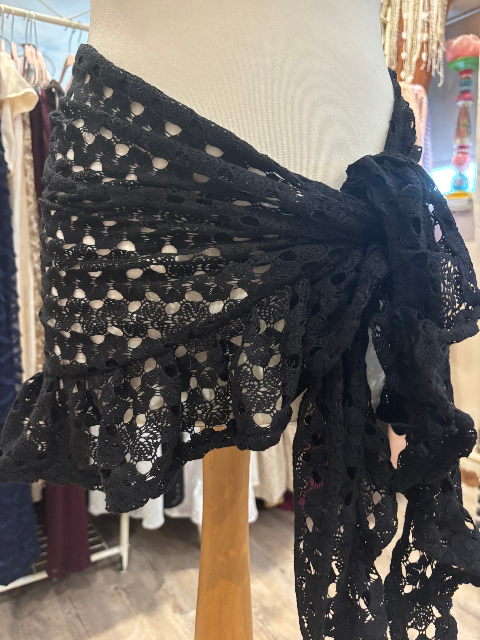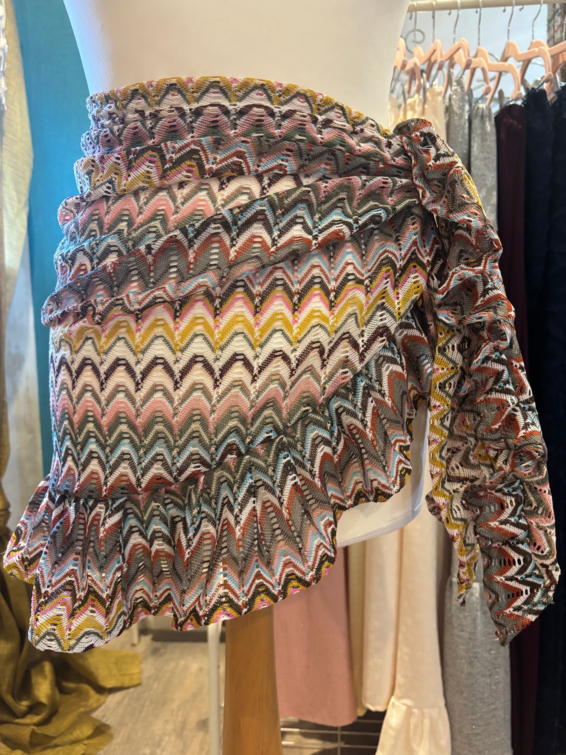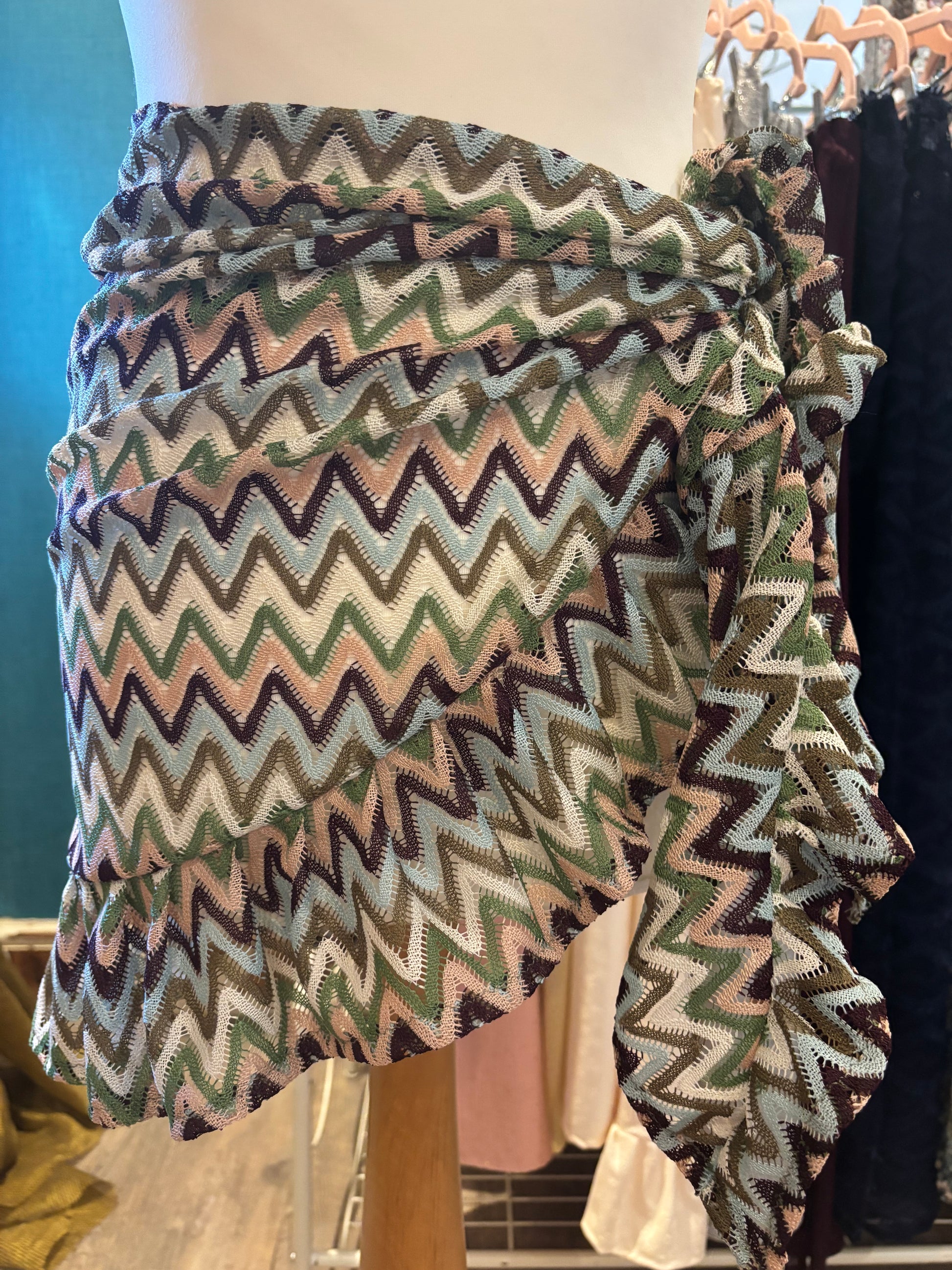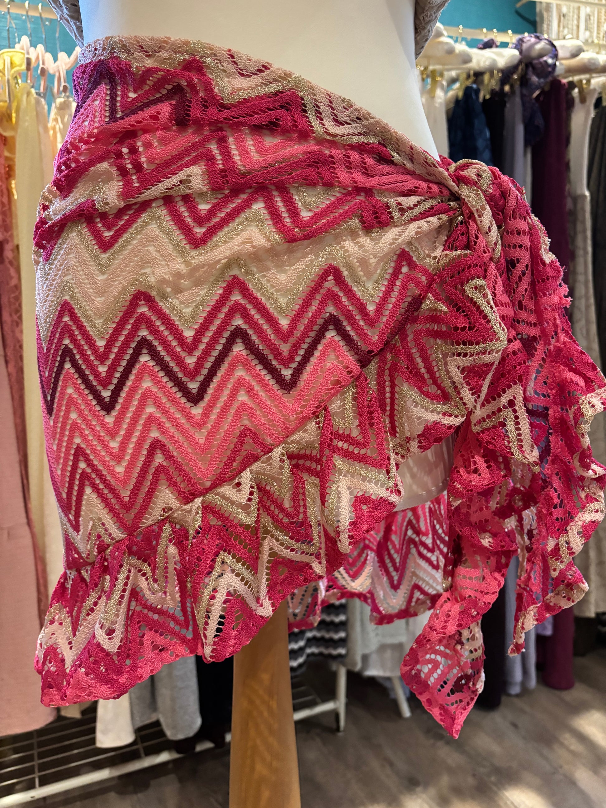 Kate is wearing our short ruffle sarong in a size xs. She is wearing our gold in the first photo & our black patchwork lace in the second photo